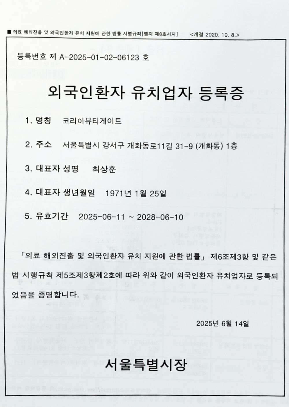 Korea Beauty Gateは韓国政府に登録された「外国人患者誘致業者」です。